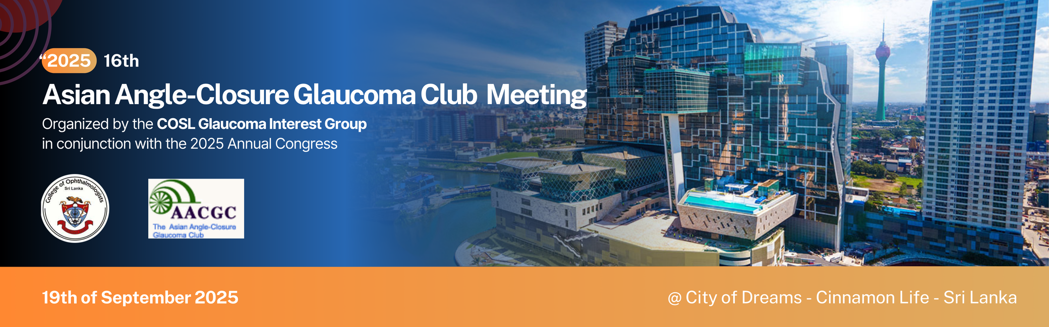 It is our great honour to host the 16th Asian Angle Closure Glaucoma Club (AACGC) meeting this year under the guidance of Prof. Tin Aung, which will be held in conjunction with the 33rd Annual Congress of the College of Ophthalmologists of Sri Lanka. This will take place on the 19th of September 2025 at the Cinnamon Life hotel, Colombo, Sri Lanka.